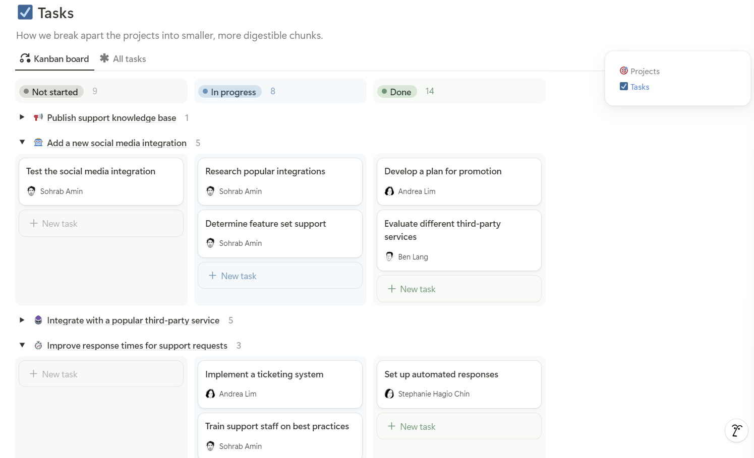 원하는 Task를 모두 만들고 난 후 Task를 클릭하면 등록되어 있는 일정이 보이는데 각각의 일정을 클릭하면 사이드바 형태로 일정이 펼쳐져서 해야할 사람, 날짜, 상태 등을 변경할 수 있습니다.
