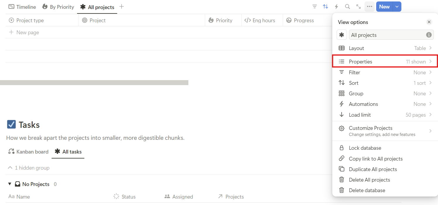 이 템플릿은 간트차트와 칸반보드를 함께 제공하고 있습니다. 간트차트는 데이터베이스 보기 방법(Layout)을 Timeline으로 설정한 것이고, 칸반보드는 Board로 설정한 것입니다.