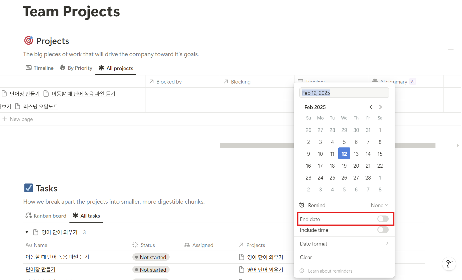 마지막으로 타임라인이 제일 뒤쪽에 있으니 잊지말고 채워주세요! 기간을 설정하기 위해서는 End date를 활성화 해주시면 됩니다.
